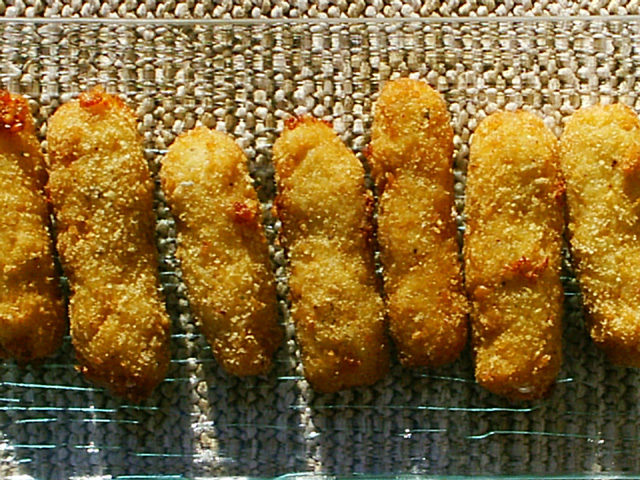 Notes In Southern Italy rice is often referred to as "the food of the Milanese." In the 19th century Southern Italians rarely cooked rice. In fact, they looked at it with suspicion. However, after the unification, Northerners took to Southern cooking and vice versa. Apparently, in the 1950s, "rice croquettes" were a regular fixture in Italy's capital city. At that time the "friggitori," venders of fried foods, would offer them to passersby. As far as I know "friggitori" no longer operate in Rome -- they've been replaced by fast food joints I guess.... Some food historians claim that pork fat was generally used to make fritters in the South while butter was used in the Alpine areas and olive oil was used in Tuscany and Etruria. However, according to what my Italian-born mother tells me olive oil (not pork fat) was used to fry sweet fritters (As most farmers only owned 1 pig, pork fat was in short supply, whereas olive oil was more readily available). Of course, this may have been so in Molise, but not necessarily in other parts of the South. In any case, nowadays most Italians use peanut, sunflower, canola or all-purpose vegetable oil for deep frying. Professional chefs vouch for peanut or canola oil as being the best for deep frying.... Rice rolls or croquettes can be made with or without a cheese filling in the center. Generally, good cooks can make lovely rice croquettes without adding any breadcrumbs to it, obviously adding more Parmesan would be a better alternative to adding breadcrumbs, but then the dish would end up being very expensive. Basically, it's up to the cook to decide how he or she will make any given recipe. In fact prior to World War II Italian cookbooks routinely used the words "as much as needed...." In Rome rice croquettes have very colorful names. Often rice rolls with mozzarella in the center are referred to as "suppli al telephono" because the melted cheese threads look like telephone wires. A cheese-ragu rice roll variation is known as "suppli come Dio comanda (Rice croquettes as God commands). Frankly, rice croquettes have a nice enough flavor, but if I had to make a choice between rice croquettes and potato croquettes, I'd definitely pick the ones made with potatoes. Photo: Mary Melfi. |