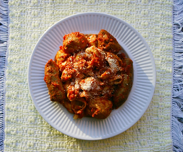 Notes To make "real" Southern-style tomato sauce one would have to can their own tomatoes in the fall, and use one's own cans to do the sauce. My mother does and her sauce is truly out of this world. But as I don't do any canning I have to use what is commercially available. The end result is not as good (Not even half as good!) as the real thing, but that's life. When my mother runs out of home-canned tomato sauce, she uses the recipe attached to this entry. Actually, that hasn't happened for years -- possibly since the 1960s. Back then few first-generation Italians did any canning. Certainly none of my relatives did. Most used store-bought tomato paste, added water, meat, spices and herbs and that was it. Prior to World War II this style of sauce was often called "u suc". Italian-Canadians still call it "u suc" but nowadays those living in Casacalenda refer to a similar style of tomato sauce as "al ragu." ..... Photo: Mary Melfi. |