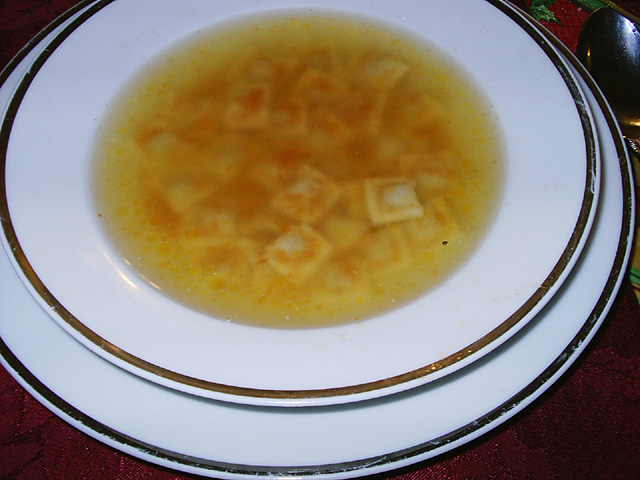 Notes According to this contributor's mother Southern Italians living in the countryside prior to World War II rarely made soups. While the local gentry and professional class living in the small towns in the South did prepare soup dishes for special events, including Christmas and Easter, generally speaking farmers did not. Soups were only made for weddings and baptisms. "Brodo di pollo" (chicken soup) was also made when someone was ill or a woman had just given birth. "Brodo di pollo" was believed to have medicinal value. Of course, one had to be really sick before a chicken would be slaughtered for the sole purpose of making soup out of it. So in that case it was really "chicken soup for the soul" as often that may have been the person's last meal. Also, whatever soups were served in Southern Italy (prior to World War II) were limited in variety. Most households served "brodo di pollo" with pasta in it or beef broth with pieces of stewed meat. Of course, they made "minestrone" for everyday consumption, but that wasn't considered a soup, it was considered a main meal -- a sort of vegetable stew. Any soup whose stock did not include fresh chicken meat or beef was classified as everyday food, and not worth much. Nowadays North Americans of Italian descent serve soups all the time and their soups vary in content and texture. While second and third generation Italians enjoy the new flavors, older Italians are often repulsed by soups that include milk or cream. "Brodo di pollo" is their idea of what a soup should be. Photo: Mary Melfi. |