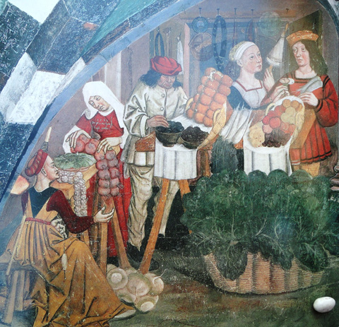 This recipe was first published in the cookbook entitled, "Specialita Culinarie Italiane 137 Tested Recipes of Famous Italian Foods, Sold for the benefit of North Bennet's Industrial Training & Social Service Work in the North End of Boston." It was published in Boston, Ma. in 1937. The entire cookbook is available on line for free at "pds.lib.harvard.edu/pds/view." Image -- Castello di Issogne: Market scene, 15th century. |