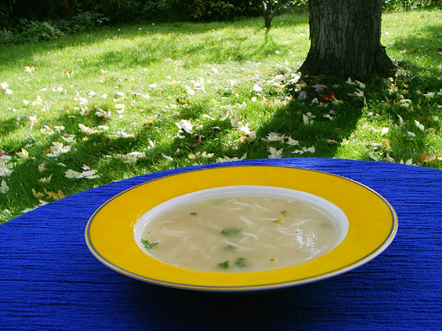 In the Southern Italian countryside, prior to World War II, chicken soup was only made for very special occasions, and/or if someone in the family was ill (Italians, like the French and German, believed chicken soup had medicinal value). If someone were ill and chicken soup was prepared, it would be served as The main meal. It would not be considered a first course. Of course, if it were served at a wedding banquet, then it would have been seen as a first course. In any case, sagnatelle would generally be added to the chicken broth. However, as previously noted, chicken soup was rarely cooked up. For everyday consumption most cooks simply made broth with tomatoes, onions and celery [For recipe see Sagnatelle con Brodo, Version I]. When Italians from Molise immigrated to North America they made chicken soup any old time. Most cooks, (including my mother) did not make home-made sagnatelle to add to the chicken soup. They used store-bought spaghetti -- they would break it with their hands (about 4 inches long), cut the spaghetti in boiling water, and then place the cooked spaghetti in a bowl and toss it with a bit of broth etc. Growing up I simply assumed this is how the dish was served in Italy. I had no idea that home-made "sagnatelle" was used and/or that by using "sagnatelle" instead of store-bought spaghetti the taste of the dish would dramatically improve.... Photo: by the contributor. |