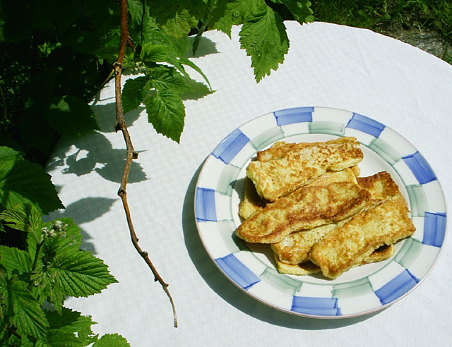 Notes This recipe was taken from the copyright-free cookbook, "Simple Italian Cookery," compiled by Antonia Isola (1912). "Golden Bread" can be found on page 50, in the "Meat" section. Actually, this recipe is part of a larger dish titled "Fried Sweetbreads, Croquettes, Liver, Etc. -- Fritto Misto alia Romana." The author notes: "Golden Bread, Brains, Sweetbreads, Croquettes of Chicken and Veal and Eggs, Calf's Liver and Pumpkin ? all these different ingredients should be fried each in its own manner as follows, a small quantity of each, and served all together on one platter with slices of lemon........" P.S. I tried this recipe and found that even though it is very similar to "French toast" which is made with bread, milk and eggs, it is not nearly as tasty. The water used in the recipe does diminish the taste of the egg, and gives it a more delicate flavor -- one almost has the feeling that one is eating an omelette rather than fried bread -- still, it doesn't quite have the rich taste of "French toast." Prior to World War II Italians used very little milk in their everyday meals, so it is not surprising then that they did not include it in this recipe. Water was often used to make dried-out bread edible. Back then Italians did not waste food..... Photo and notes: Mary Melfi. |