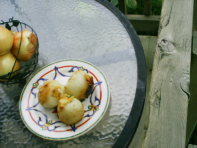Directions "Take six onions. Take out the centers with an apple-corer and fill them up with the following stuffing: One tablespoon of grated Parmesan cheese mixed with two hard-boiled eggs and chopped parsley. Boil them first, then roll them in flour and fry them in olive-oil or butter. Then put them in a baking-dish with one-half tablespoon of grated Parmesan cheese and one tablespoon of melted butter. Put them in the oven and bake until golden."