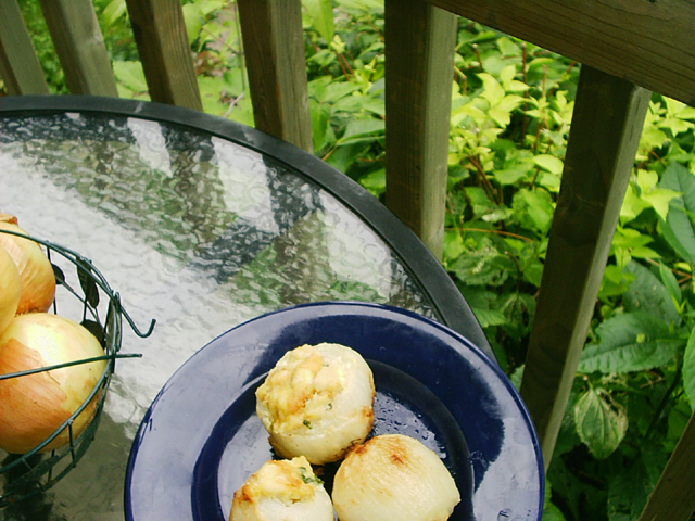 Directions "Take six small onions, remove the centers with an apple-corer. Boil them for a few moments, drain them, and stuff them with the following: Take a piece of bread, dip it in milk, squeeze out the milk, and mix the bread with one tablespoon of grated Parmesan cheese, the yolks of two hard-boiled eggs. Mix well together, then add some fine-chopped parsley, a pinch of sugar, salt and pepper, and the yolk of one raw egg; mix again well, and then stuff the onions with the mixture. Then dip them in flour and in egg, and fry them in lard. Put them on a platter and serve