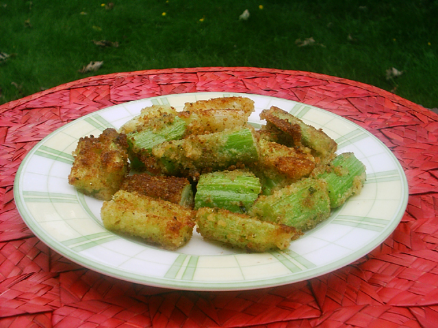 Directions "Cut off the green leaves, and cut the stalks of the celery in pieces about an inch long. Wash them and then put them into boiling water for fifteen minutes. Then dry on a napkin. Beat up an egg with a little stock, or hot water, add salt and pepper, dip the celery in, then roll it in bread crumbs, and fry in boiling lard."
