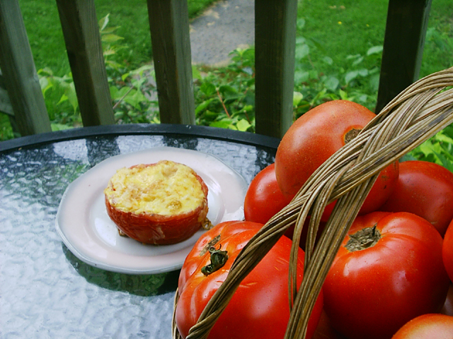 Directions "Take four rather unripe tomatoes of about the same size, put them into boiling water and boil for a few minutes. Cut off the stem part, and take out some of the inside with as many seeds as you can. Fill them with boiled rice and some mushrooms chopped up small. Pour over them the yolks of two eggs, place them in the oven to color; serve hot."