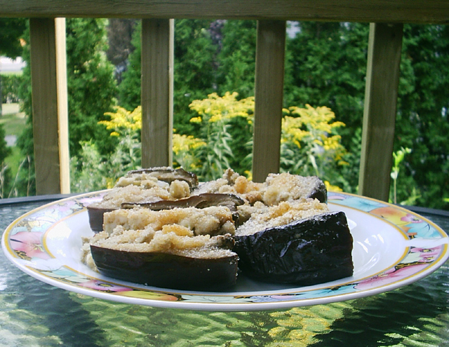 Directions "Cut each egg-plant into four, leaving the peel on. Make four cuts in each piece and fry in boiling fat for one minute. Remove the fleshy part of the egg plant and fill it with any force-meat you have. Sprinkle the top with breadcrumbs and a little melted butter, brown in the oven for about ten minutes, and serve hot."