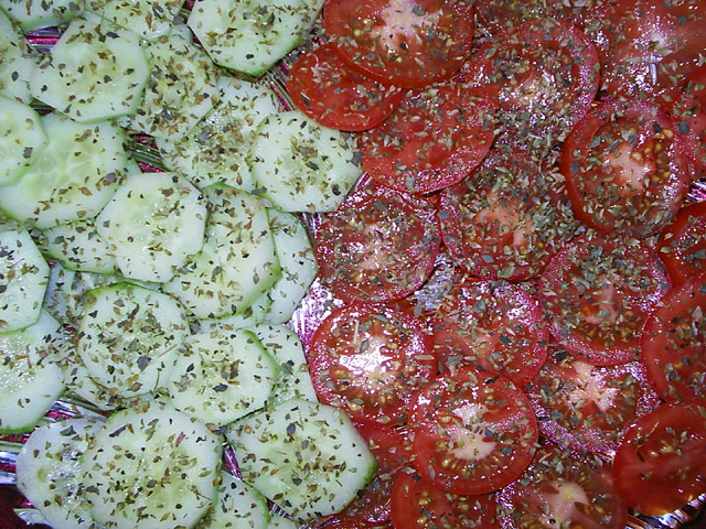 Notes Nowadays a dish consisting of sliced tomatoes and cucumbers is presented as an appetizer, but in pre World War II Italy such garden-variety vegetables were served on bread and eaten for lunch or as a snack. Back then pannini were reserved for special events so most of the time the vegetables were topped on country bread made from white flour or from corn. Often tomatoes were used to dampen bread that had dried out. The tomatoes weren't actually sliced, but squished. So was the garlic (it was then rolled on top of the bread to flavor it). Sometimes slices of air-dried sausage were added to the mixture, but not necessarily. When Italians arrived in North America they were surprised to find that the locals ate "sandwiches" flavored with mayonnaise. Possibly pre-sliced factory-produced white bread bagged in plastic topped the list as the food most detested by new arrivals. Next on the list was mayonnaise. Or was it Campbell soup cans? In any case, anything that wasn't made at home was looked upon with suspicion (and with good reason may I add!). |