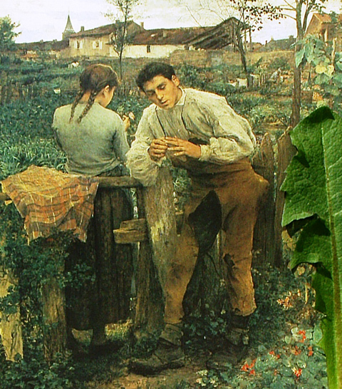 Directions Combine boiled dandelions with cooked spaghetti, season with salt and pepper, sprinkle with olive oil and Parmesan cheese. Notes This recipe was taken from "The Complete Italian Cook Book: La Cucina" by Rose L. Sorce. It was published by Grosset & Dunlap in 1953. For the entire copyright-free cookbook see www.archive.org.... Image -- Jules Bastien-Lepage: L'Amour champetre, 1882. |
