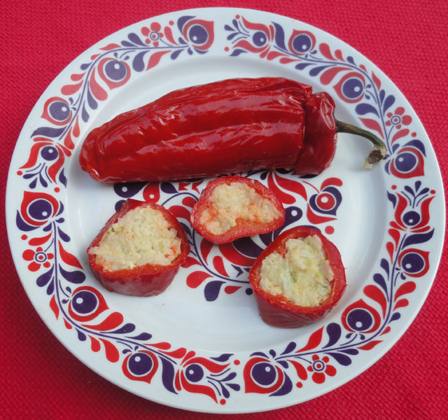 After taking them out from the fridge, remove the plastic wrap, and using a sharp serrated knife cut the peppers into thick 1/2-inch slices (The skin of the peppers don't break up if the peppers are cold, but they do if they are cut while they are warm. Also, a serrated knife helps make a smoother cut than a regular kitchen knife.). N.B. The rice stuffing can easily dry if it is exposed to the air for too long, so if one has to slice them a bit ahead of time, it's important to cover the slices with plastic wrap as this will help keep the rice stuffing moist.