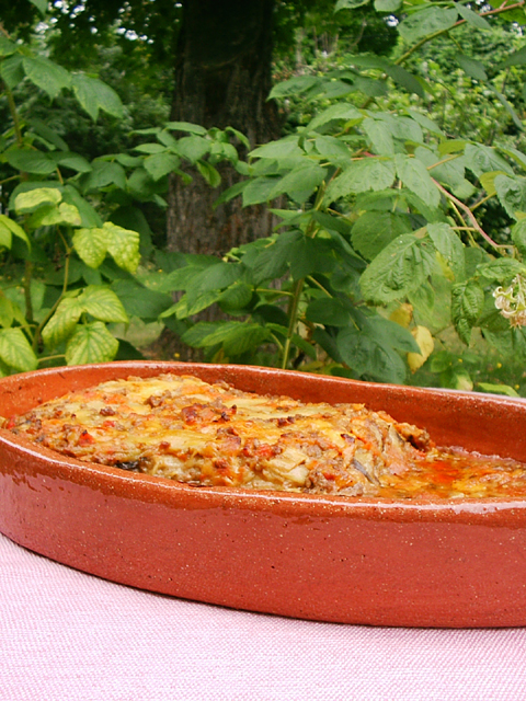 14. Arrange slices of fried eggplants on the tomato sauce.