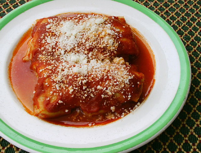 In Italy, prior to World War II, cannelloni was made for very special occasions. In the countryside any pasta that was stuffed and/or baked (pasta al forno) was generally done only for weddings or baptisms. In well-to-do households they may have made it at Christmas or Easter, but in poorer households they generally had chicken with salad and that was about it. Of course, in North America Italians made up for what they were deprived of. Cannelloni became a standard dish for Christmas and/or Easter in most households. In the 1960s At my mother's house if she made cannelloni for Christmas than she would make lasagna for New Year's (or vice versa). Back then it wouldn't be Christmas or Easter without home-made pasta. By the late 1980s fewer and fewer Italians (including my own mother) were making their own pastas. Either they bought "fresh" pasta at a high-end Italian pastry shop or they would settle for ravioli. Somehow Easter and Christmas are no longer quite the same at this point in time -- many first generation Italians past on (hopefully to a better world than is ours) and second generation Italians married, had their own children and their own families to please, and suddenly the people round the dinner table were quite not the same anymore. Some families managed to stay together and share the holidays, but many other families went their separate ways, quite happy Not to cook for a large group of people. Italian families are no longer bound by the old codes of conduct -- meaning, just because one belongs to a family by blood is no guarantee that one will be included in its get-togethers (Let alone be loved!). That's the North American way and slowly but surely it is becoming the Italian way as well.....My mother usually makes half of the cannelloni stuffed with ricotta and the other half with veal. Generally, she makes this dish at Christmas, Easter and any other time there is a special gathering at her house. Often, my mother makes the cannelloni and then freezes them. The night before they are needed she places the frozen cannelloni in the fridge to thaw them out. She then bakes the thawed-out cannelloni in freshly-made tomato sauce. Sometimes one or two of the cannelloni are a bit burnt, but generally speaking they are heavenly. Photo: Mary Melfi. |