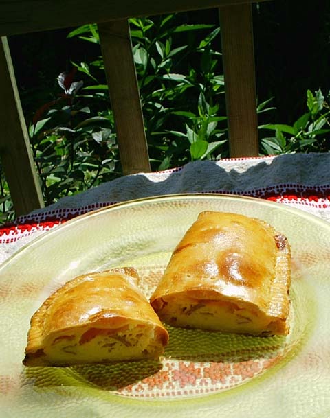 Sciadunes (Half-moon shaped Easter pastries, filled with Pecorino Romano cheese, Provolone, Ricotta, pepperoni and ham)