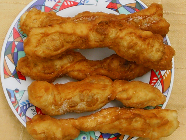 Ingredients For recipe see Italy Revisited/Recipes/"Fritters" Directions Notes According to the contributor's aunt, Mrs. A. Palazzo, in the 1930s sfingiun were actually made as very long cylinders (over 24 inches). When those from her town immigrated to Canada because extra large frying pans were not availabe, they shortened the length of the sfingiun. In essence the traditional sfingiun would look like Casacalenda's "scrapelle." Photo: Mary Melfi. |