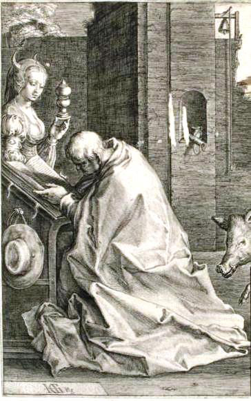 One time Saint Anthony tried hiding in a cave to escape the demons that plagued him. There were so many little demons in the cave though that Saint Anthony's servant had to carry him out because they had beaten him to death. When the hermits were gathered to Saint Anthony's corpse to mourn his death, Saint Anthony was revived. He demanded that his servants take him back to that cave where the demons had beaten him. When he got there he called out to the demons, and they came back as wild beasts to rip him to shreds. All of a sudden a bright light flashed, and the demons ran away. Saint Anthony knew that the light must have come from God, and he asked God where was He before when the demons attacked him. God replied, "I was here but I would see and abide to see thy battle, and because thou hast manly fought and well maintained thy battle, I shall make thy name to be spread through all the world."[8]