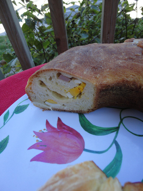 The recipe called "tortano" and the recipe called "castiello" are often one and the same, though not necessarily; the names are used interchangeablely to indicate a rich country cheese and salami tart. However, the "castiello" is generally decorated with hard-boiled eggs, whereas the "tortano" has the hard-boiled eggs inside the dough, as part of its stuffing..... The following text comes from Wikibooks (Machine google translation): "The tortano is a typical part of rustic Neapolitan cuisine. It is very similar to casatiello from which it differs in the lack of whole eggs in the dough. Currently both names, casatiello and tortano are often used interchangeably to indicate a country rich cheese and salami stuffing in respect to the original recipes. Casatiello is typical of Easter. The following text comes from Italian Wikipedia (Machine google translation): Casatiello.