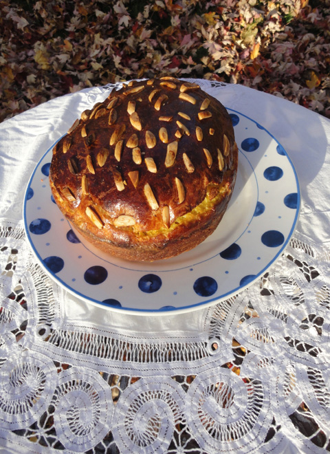 Fugassa de Pasqua (Italian Easter sweet yeast dough cake, made with egg yolks and butter; topped with almonds)