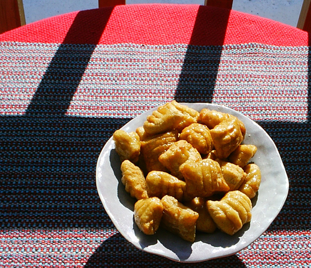 Ingredients For recipe see Italy Revisited/Recipes/ "Fritters" Directions Notes Tordilli or Turdiddri (also spelled turdilli) are possibly the best known Calabrese sweet fritters. There are hundreds of recipes on the world-wide web for tordilli cookies though most of the recipes are in Italian. All the recipes include flour, wine and eggs as well as honey (for dipping) but their seasoning differs.... Photo: Mary Melfi. |
