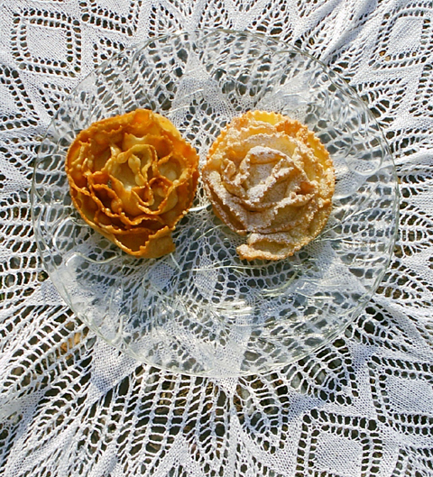 According to my mother, prior to World War II, caragnoli were mostly made for the Christmas holidays in Casacalenda, Molise (though some well-to-do people also made them for New Year's, Epiphany and Carnival). Growing up, her own mother didn't make caragnoli for the Christmas holidays as the fritters cost too much (The honey, which the fritters were dipped in, was very expensive at the time). Her mother, my maternal grandmother, Nonna Seppe, made "scrappelli" for the Christmas holidays -- they were cheaper to make as they were made with the exact same dough the household used to make bread, except, of course, "scrappelli" were fried, while bread was baked. However, after my mother got married, her mother-in-law, did make caragnoli and her caragnoli were shaped as rose-wheels. My aunt, Zia Rosina, however, notes that growing up, her own mother made the caragnoli in a spiral-shaped form. So it appears that "caragnoli" were made in a variety of shapes, sometimes the different shapes went by the same name (caragnoli) and sometimes they didn't (depending on the town in question). In any case when my mother immigrated to Canada she (along with my aunts Zia Teresa and Zia Nunziatina who had also moved to Montreal) noticed that Italians from other regions made their fritters in the shape of bow ties, and these fritters were much easier to do. So, my mother (as well as many of my relatives) started to do their caragnoli in the shape of bow ties or half ties (anything but rose wheels).... Growing up, I didn't like fried pastries of any kind. My late aunts offered them to me and I would say, "No, thank you." I would often rush out of the room rather than take a bite of a sweet fritter. I had no idea back then that one day I would long for my late aunts' sweet fritters. Actually, it's not the sweet fritters I long for, but for my late aunts' presence. So now whatever caragnoli I eat are flavored with nostalgia. And because of it they have a unique and strangely wonderful taste. Tenderness personified. P.S.In some parts of Molise bow-shaped fritters are called "caragnoli" and rose-shaped fritters are called "rosacatarre" or rosachitarre" but in other parts of the region, such as in the town of Casacalenda, both bow-shaped and rose-shaped fritters are referred to as, "caragnoli." Personal comments and photo: Mary Melfi. |