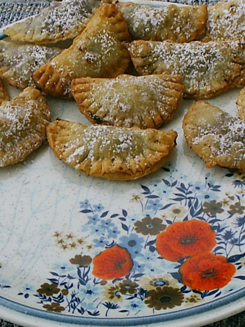 Notes Nowadays any bite-sized sweet pastry pocket in North America is called a "ravioli" but in Italy the names vary from town to town -- well, at least, they did prior to World War II. In some regions this recipe might also be called "Ravioli di San Giuseppe", but in other regions it might not. My dream is to collect the original regional recipes with their original names, but for now, that's just a dream. I simply can't do this on my own, as it's impossible to know when a so called traditional Italian recipe presented in a cookbook is really traditional or simply an adaption of one. Often, the adaptations are just as good or even better than the originals, but that's not the point of this website. This is a recipe archive, more than an on-line cookbook. The interesting thing (at least for me) is to find out how things were done in the past, rather than to come up with new recipes. As I'm dependent on "the kindness of strangers" for this food archive to grow and be useful, I am doing what I can to come up with representative recipes from both the North and South of Italy.... In any case, I know for sure that in Molise pastry pockets are not called "ravioli" but "fiodone," though one "ravioli" type of pastry is called "cauciuni." However, for "cauciuni" chick peas are used to make the stuffing rather than jam. Prior to World War II jam was in short supple. First of all, sugar was expensive. And second of all, few farmers had fruit trees on their property. And as most farmers only used the produce they themselves grew (Didn't go out and shop!) they simply concocted recipes that made use of what they had. Most farmers had vineyards, so they did make grape jam, but not that much of it (most of the grape collected was used to make wine). So, I guess, Italian cooks figured out how to make a good sweet paste without the use of fruit. Mashed up cooked chick peas sweetened with sugar, oddly enough, tastes very similar to jam.... One more thing, some cooks brush the fried pastry pockets with warmed-up honey rather than sprinkle them with icing sugar prior to serving. Apparently, prior to World War II, in some smaller Italian towns (like the one my mother grew up in), icing sugar was not available. Nonetheless, my mother nowadays dusts her fritters with icing sugar. Actually, she often divides the fritters in two portions -- half are coated with dusting sugar, the other half with honey. The point being -- in the kitchen one uses what one has. And if one has too much food, well then, one simply has to give some away. Why else would people have dinner parties? Photo: Mary Melfi. |