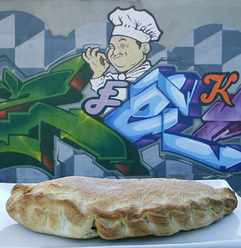 o Process one calzone at a time -- dampen the edges of the circle of dough with water, fold the dough over, and then crimp the edges together.