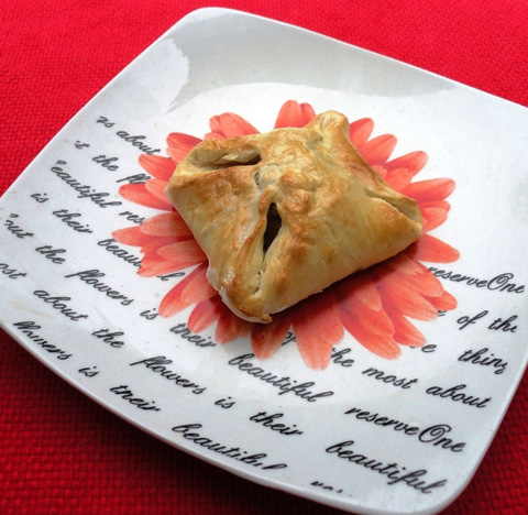 For each square of dough: take the corners, and fold toward the center of the filling composing a bundle open.