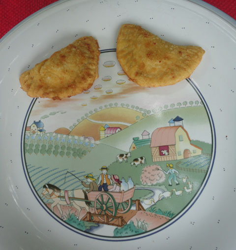 Using a cookie cutter cut out 3-inch rounds (Process a few at a time as the dough can easily dry out and when it does, it will be harder to fold over and seal into half moons.).