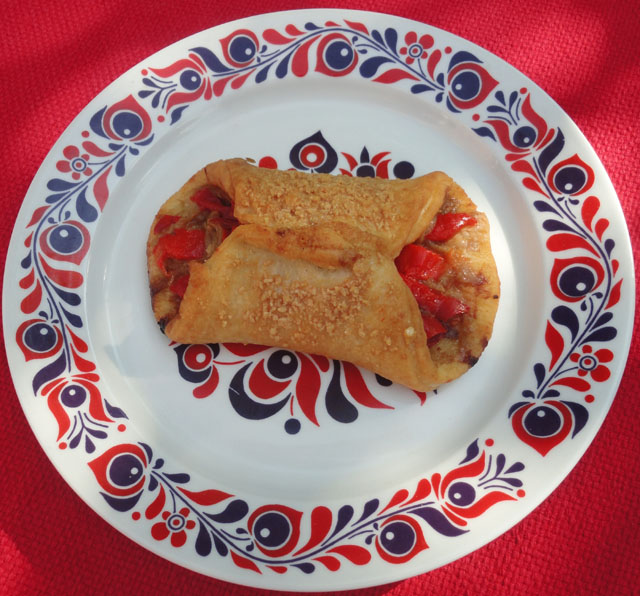 Liking calzoni but finding the standard double-crusted varieties too starchy, I decided I would try out a calzoni-style that uses less dough. Imitating the look of some Middle-Eastern savory stuffed pastries, I didn't seal the calzoni in the traditional manner, but rather kept them half opened. To my delight this style worked (Well, it worked for me!). This style of calzoni is very easy to do, especially if one uses store-bought fresh pizza dough as I did (The pastry shop, "Italia, La Casa della Pizza" at 5540 Jean-Tale East has the best pizza dough in Montreal in my opinion). Loving caramelized onions, I used a lot in this recipe Loving red peppers (How can one not love red peppers?) I included a fair amount as well of this vegetable in making these non-traditional calzoni. Because red peppers (or yellow ones) are fairly expensive, I myself would only do this recipe when the peppers are in season. Green peppers are cheaper, and using them would decrease the cost but too much flavor would be sacrificed. If one wants to make a frugal version of this recipe, one can avoid the use of peppers altogether. One can use carmelized onions alone and the result would be quite fine. Add a few hot chilies and you get something really special. A spinach-stuffed calzoni can be special as well, but the problem is that it requires a lot of work (washing the spinach, cooking etc.). Also it's expensive. For those who don't mind the work and love the high nutritional value spinach gives any dish, using it in a calzoni stuffing is the thing to do. Personally, I would go for lots of caramelized onion and use spinach or red peppers for their decorative value. But that's me. As frugal as I am, in this recipe, because not a large amount is used, I would go with the expensive Parmesan Reggiano rather than the cheaper all-purpose Parmesan. Luckily, there is no reason to take this advice or any other advice given by this home cook. What's so wonderful about cooking in one's own kitchen is that one has the power to do as one pleases. Photo and comments: Mary Melfi. |