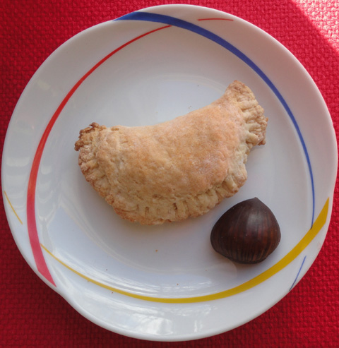 Place the filling in a round. Fold the dough over, making half moons, and then seal with a fork.