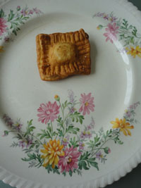 Put about a teaspoon in the center of each square of dough [Too much stuffing will not only make it hard to seal the cookies, but the end result will not taste as good] and then top the bottom squares with the top.
