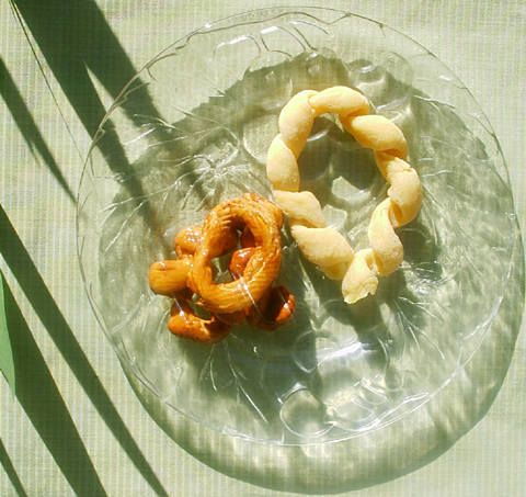 o Make two very thin taralli-style ropes (about 1/8 of an inch thick and long enough so that they can be attached to the two sides of the spiral-shaped caragnole).