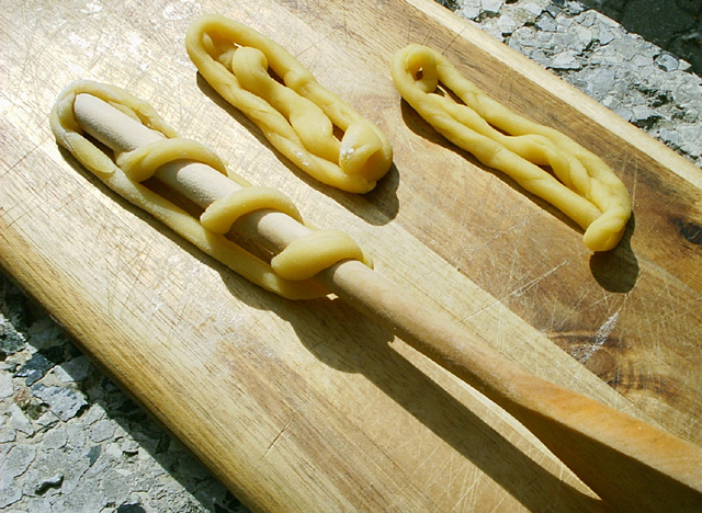 Notes Tony Alfieri notes that in his home town of Santa Croce di Magliano what was known as a "caragnole" in Casacalenda and in some other parts of Molise was there known as a "scarulelle" (For the recipe see Italy Revisited/Fritters -- "Scarulelle."). In Santa Croce di Magliano the word, "caragnole," also referred to a fritter, but the shape of that fritter was very different from the "rose-shaped wheels" or "rosettes" that were made in Casacalenda. In Santa Corce di Magliano a "caragnole" looked a bit like a pretzel, but as the fritter was made by twisting the dough around a wooden stick, the end result was much more complicated than a pretzel. Possibly, this style of fritter was more similar to Calabria's "scaliddre" than they were to Casacalenda's "caragnole." In any case when those from Santa Croce di Magliano arrived in Canada in the late 1950s they soon learned that those from other areas of Molise referred to "scarulelle" as "caragnole" and so quite a few individuals adopted the use of the word (Those from Casacalenda out-numbered those from Santa Croce by a long shot, at least, in the Montreal area). Because Santa Croce's original "caragnole" were difficult to make, few second generation Italians from this town bothered to make them. Nowadays Molise's tourist brochure generally refer to the fritters made in this region as "caragnoli" and all the other names that were once used in the very small mountain villages are more or less forgotten.... The "caragnoli" shown in the photo attempt to capture the design of the fritters as they were done in Santa Croce di Magliano in the early 1950s. |