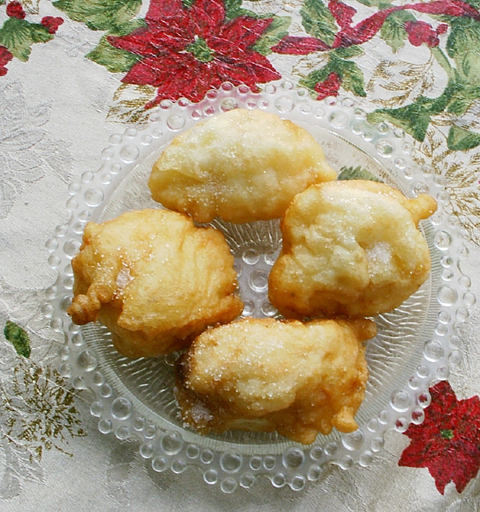 Notes Mrs. Carmella Romano notes that the batter used to make these fritters is the same as that used for "zeppole con alici," zeppole with anchovies. In fact, when she makes them for the Christmas holidays she uses the same batter for both types of fritters, except of course she does not add the anchovies for "zeppole di vigilia di Natale." Mrs. Carmella Romano remembers that when she was growing up in her hometown of Cantalupo in the 1940s "zeppole di vigilia di Natale" were served at the start of the meal rather than at the end of it. Even though they are dusted with sugar the fritters are not seen as dessert, but rather as an entre. In the 1940s zeppole were only made for Christmas Eve and not at any other time. If there were leftovers they might be served on Christmas, but they were rarely any leftovers as most cooks made just a few fritters (one or two per person). At that time fritters were considered expensive treats as the olive oil needed to fry them was expensive (especially for those who did not grow their own olive trees). Even though the olive oil that the fritters were fried in was reused to fry other foods, the fritters usurped a great deal of oil, so they were thought of as a luxury food served only for the holidays..... The fritters in this entry were made by Mrs. Carmella Romano for Christmas Eve festivities; the photo was taken by Mary Melfi. |