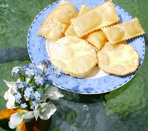 Notes Marisa Pastore recalls that when she was growing up in Italy these fritters were given by "Le Suore Orsoline" to young school children learning Catholicism. She too had the pleasure of eating them in the 1950s. She loved them so much that when she got older she asked for the recipe. Sister Catherina gave it to her. Marisa noted that these fritters are known as "chiacciere" because they induce people to "chat" (The word Italian "chiacciere" can be translated as chatter). According to folk lore the more "chiacciere" you eat, the more likely it is that you talk, and keep on talking and socializing and so on. Also, the fritters (if well-made) are very crunchy, so that they themselves make noise when they are being eaten, and so they too sound like they are chatting up a storm..... Photo: Mary Melfi. |