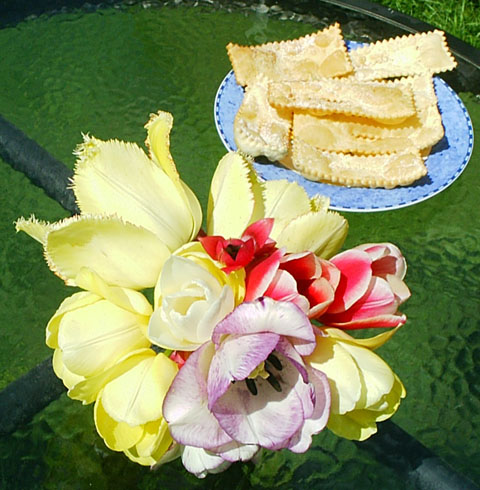 Notes Lina Pietrantonio recalls that her father who was born in Northern Italy (though not in Venice) told her that this style of fritter was served for Carnival..... P.S. In some areas of Northern Italy the recipe, crostoli, does not refer to fried strips of dough but rather to fried balls of dough. For this style of fritter see the corresponding recipe in this category. Photo and notes: Mary Melfi |