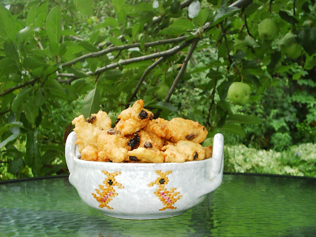 Directions "To half a pound of fine flour add sufficient water to make a thick paste; add a pinch of salt, the yolk of an egg, a little grated lemon rind and a few seedless raisins. Mix well and drop in spoonfuls into deep hot oil and fry until golden brown. Drain and serve hot." Notes This recipe was taken from "Italian Cooking" by Dorothy Daly. It was published by Spring Books in Great Britain. For the complete copyright-free cookbook see www.archive.org..... P.S. It seems that in the first part of the 20th century most fritters used little, if any sugar. For those who like their fritters sweet this recipe will be very disappointing. As this recipe does not use baking powder or yeast these "frittelle alla Fiorentina" are rather pasty. I suspect modern-day recipes for this style of fritter are much tastier than this one. Photo and notes: Mary Melfi. |