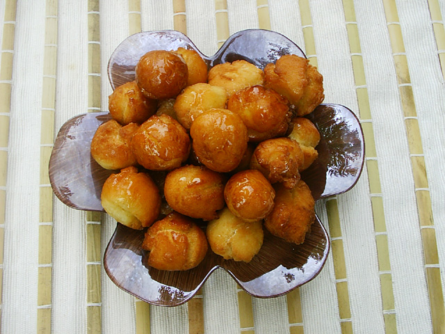 Notes There are dozens of recipes for stuffoli, some add lemon zest, others orange zest; some avoid sugar in the batter, others have plenty of it. This is my take on the recipe; if anything, it's simple to do. Those who don't like the taste of honey (I'm not that fond of it myself) can omit coating the stuffoli with honey, and simply dust them with confectioner's sugar. Of course, if you do that, then the fried cookie balls will look more like "castagnole" than "struffoli." One can always coat one half of the dough balls with honey, and the other half with dusting sugar, and get the best of both worlds. Apparently, chopped nuts are often served alongside the "struffoli.".... Photo: Mary Melfi. |