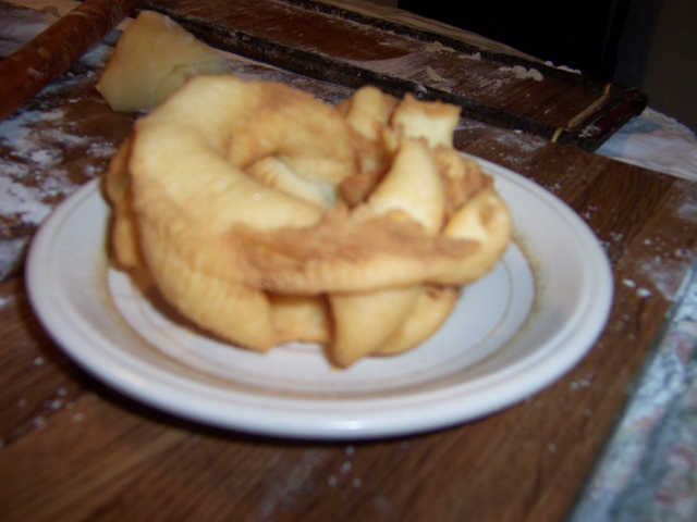 Donna Crosto notes that this style of "caragna" or "caragnoli" (spellings vary throughout Molise) which has the look of a "crown," was popular in Larino, Molise during the 1930s. To make it one required a cooking utensil called a "petre" (For a photo of the utensil go towards the end of this category, Fritters, and check out the entries entitled: "Caragna (Caragnoli) Cooking Utensil/'Petre' Pictures No. 1, No. 2 and No. 3"). Making the sweet fritters was labour intensive -- generally 3 to 4 home cooks were needed to cook the delicacies. The caragna seen in the photo used to be made by Donna Crostor's grandmother, but the recipe for the fritter was never written down as Donna's grandmother used to make it "by eye" and now the exact proportions for the ingredients needed for the fritter are not known. |