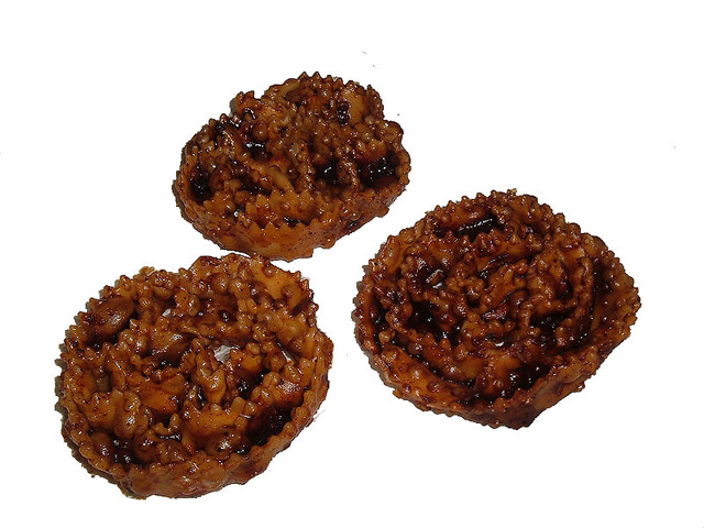 Notes The following text comes from Wikibooks (Machine google translation): "Cartellate are sweets originating in the Apulian cuisine. Cartellate From Wikipedia, the free encyclopedia. cartellate Origins Place of origin Italy Regions Apulia Basilicata Production area throughout the whole Basilicata and Puglia Details Category sweet Recognition PAT Sector fresh pasta and bakery products, biscuits, pastry and confectionery The flared (in the Apulian dialect Carteddate or scart'llat, cartiddati or puttue or klustr or even sfringioli), crustole or n?vole in Calabria , or roses or crispedde in Basilicata, are, together with Boconotti, the typical Christmas cakes originating in Foggia , but produced both in Apulia and in neighboring regions. The preparation is done by dialing a thin strip of dough, made with flour, oil and wine, white, united and wrapped on itself to form a sort of "pink" choreographed with cavities and openings, which is then fried in deep fat. There are many variations, but the recipe is the one that sees regional impregnated vin cotto lukewarm or honey , and then covered with cinnamon , powdered sugar or almonds. Other variants see them with chocolate instead of cooked wine, or simply the icing sugar. Once prepared are kept away from light and indoors. Tradition The name may derive from paper, incartellate, that is synonymous with incartocciate, according to their typical form. Prepared especially to Christmas , traditionally Christian bands represent that enveloped the Child Jesus in the crib, but also the crown of thorns. Other hypotheses, could be linked to Greek mythology, Demeter, like sweets similar in composition to those of the so-called lanxsatura, filled the flat offered to the gods according to the cult of Ceres. In this regard, both the dictionary Saracino that he Noble derive the word from the greek κάρταλλος (kartallos) = basket or basket-shaped pointed............... Original Italian text: Cartellate Da Wikipedia, l'enciclopedia libera. Cartellate le cartellate Origini Luogo d'origine Italia Regioni Puglia Basilicata Zona di produzione tutta la Puglia e tutta la Basilicata Dettagli Categoria dolce Riconoscimento P.A.T. Settore paste fresche e prodotti della panetteria, della biscotteria, della pasticceria e della confetteria Le cartellate (in dialetto pugliese carteddte o scart'llat, cartiddati o puttue oppure klustr o ancora sfringioli), crustole, o nuvole in Calabria, oppure rose o crispedde in Basilicata, sono, assieme ai Boconotti, dei tipici dolci natalizi originari del foggiano, ma prodotti sia in Puglia che nelle regioni limitrofe. Preparazione La preparazione avviene componendo nastri di una sottile sfoglia di pasta, ottenuta con farina, olio e vino bianco, unita e avvolta su se stessa sino a formare una sorta di "rosa" coreografica con cavit? e aperture, che poi verr? fritta in abbondante olio. Ne esistono numerose varianti, ma la ricetta tipica regionale ? quella che le vede impregnate di vincotto tiepido o di miele, e poi ricoperte di cannella, zucchero a velo oppure mandorle. Altre varianti le vedono con il cioccolato al posto del vincotto, oppure semplicemente lo zucchero a velo. Una volta preparate si conservano lontane dalla luce e in ambienti interni. Tradizione Il nome potrebbe derivare da carta, incartellate, cio sinonimo di incartocciate, secondo la loro tipica forma. Preparate soprattutto a Natale, nella tradizione cristiana rappresenterebbero le fasce che avvolsero il Bambino Ges? nella culla, ma anche la corona di spine. Altre ipotesi, potrebbero essere legate alla mitologia greca di Demetra, come dolci simili nella loro composizione a quelli della cosiddetta lanxsatura, il piatto colmo offerto agli Dei secondo il culto di Cerere. A tal proposito, sia il dizionario Saracino che il Nobile fanno derivare la parola dal greco κάρταλλος (kartallos) = cesto o paniere a forma puntuta. Photo: Italian Wikipedia. |