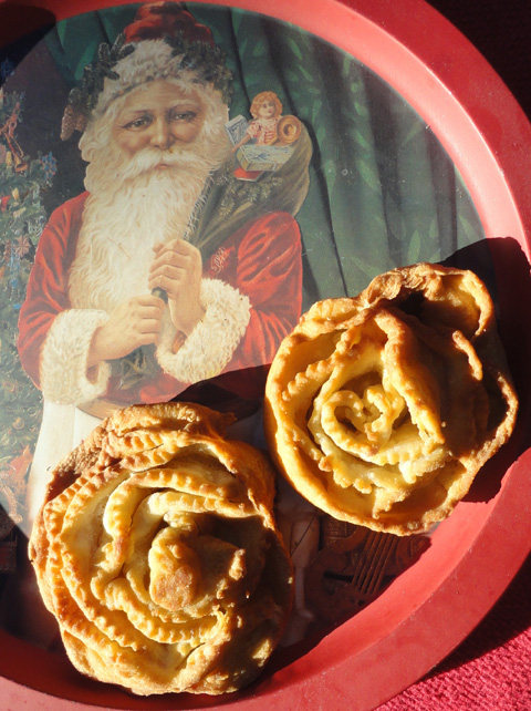 Notes The following text comes the Italian Wikipedia (Google machine translation): Cartellate Origins Place of origin Italy Regions Puglia Basilicata Area of production the whole of Puglia and Basilicata Category sweet Recognition PAT Sector fresh pasta and bakery products, biscuits, cakes, pastry and confectionery The cartellate (in the Apulian dialect Carteddate or scart'llat, cartiddati or pittue or klustr or even sfringioli) crustole or Nevole in Calabria, or roses or crispedde in Basilicata, are, together with Boconotti, typical Christmas sweets originating in Foggia, but produced both in Apulia and in the adjacent regions. Preparation is composing tapes of a thin sheet of pasta, made with flour, oil and wine white, united and wrapped around itself to form a sort of "pink" choreographed with openings and cavities, which is then fried in deep fat. There are many variations, but the typical recipe is one that sees regional impregnated vin cotto warm or honey , and then covered with cinnamon, powdered sugar or almonds. Other variants see them with chocolate instead of cooked wine, or just the powdered sugar. Once prepared are kept away from light and in indoor environments. The name may derive from paper, in cartellate , i.e. synonymous with in cartocciate, according to their typical form. Prepared especially for Christmas, in the tradition of Christian bands that represent wrapped the baby Jesus in the crib, but also the crown of thorns. Other assumptions, could be linked to Greek mythology of Demeter, as sweet similar in their composition to those of the so-called lanxsatura , the heaping plate offered to the gods according to the cult of Ceres. In this regard, both the dictionary Saracino that the Noble derive the word from the greek κάρταλλος (kartallos) = basket or basket-shaped Pointed Dialect - History and Traditions Dialect Bari - Articles: Ndegheltte (sweet treats).... Original Italian Text: Cartellate Da Wikipedia, l'enciclopedia libera. Cartellate le cartellate Origini Luogo d'origine Italia Regioni Puglia Basilicata Zona di produzione tutta la Puglia e tutta la Basilicata Dettagli Categoria dolce Riconoscimento P.A.T. Settore paste fresche e prodotti della panetteria, della biscotteria, della pasticceria e della confetteria Le cartellate (in dialetto pugliese carteddte o scart'llat, cartiddati o pittue oppure klustr o ancora sfringioli), crustole, o nvole in Calabria, oppure rose o crispedde in Basilicata, sono, assieme ai Boconotti, dei tipici dolci natalizi originari del foggiano, ma prodotti sia in Puglia che nelle regioni limitrofe. La preparazione avviene componendo nastri di una sottile sfoglia di pasta, ottenuta con farina, olio e vino bianco, unita e avvolta su se stessa sino a formare una sorta di "rosa" coreografica con cavit e aperture, che poi verr fritta in abbondante olio. Ne esistono numerose varianti, ma la ricetta tipica regionale quella che le vede impregnate di vincotto tiepido o di miele, e poi ricoperte di cannella, zucchero a velo oppure mandorle. Altre varianti le vedono con il cioccolato al posto del vincotto, oppure semplicemente lo zucchero a velo. Una volta preparate si conservano lontane dalla luce e in ambienti interni. Il nome potrebbe derivare da carta, incartellate, cio sinonimo di incartocciate, secondo la loro tipica forma. Preparate soprattutto a Natale, nella tradizione cristiana rappresenterebbero le fasce che avvolsero il Bambino Gesu nella culla, ma anche la corona di spine. Altre ipotesi, potrebbero essere legate alla mitologia greca di Demetra, come dolci simili nella loro composizione a quelli della cosiddetta lanxsatura, il piatto colmo offerto agli Dei secondo il culto di Cerere. A tal proposito, sia il dizionario Saracino che il Nobile fanno derivare la parola dal greco κάρταλλος (kartallos) = cesto o paniere a forma puntuta...... Photo: Mary Melfi. |