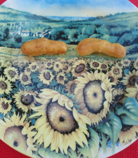 Notes Though the Italian word, "favette," can be translated as "little beans," these particular sweet fritters look more like "fingers" than beans. In some areas of Italy (both South and North) bean-shaped almond cookies, often called "fave dei morte" are made for The Day of the Dead (November 2nd), but these almond cookies are baked, not fried. Generally speaking, sweet fritters are associated with Carnival and Christmas festivities in Italy. Comments and photo: Mary Melfi. |