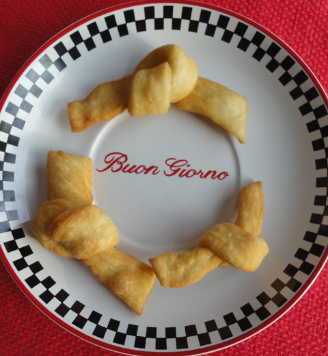 Notes The recipe in this entry was adapted from one published in the cookbook, "Italian Cooking: a Treasury of Italian dishes for Every Occasion" by Luisa e Ruggieri (New York: Plenary Publications International, 1973). The cookbook can be borrowed for free on the on-line public library, www.openlibrary.org.... The following text comes from Italian Wikipedia: Le chiacchiere sono un tipico dolce italiano, chiamato anche con molti altri nomi regionali. Sono tipici dolci di carnevale. Hanno la forma di una striscia, talvolta manipolata a formare un nodo (in alcune zone prendono infatti il nome di fiocchetti). Sono fatte con un impasto di farina che viene fritto o cotto al forno e successivamente spolverato di zucchero a velo. Le chiacchiere sono conosciute con nomi differenti nelle diverse regioni italiane: bugie (Genova, Torino, Asti, Imperia), italianizzazione del ligure böxie; cenci o crogetti (Toscana); strufoli o melatelli (se con miele) zona Grosseto, Massa Marittima (Toscana); chiacchiere (Basilicata, Sicilia, Campania, Lazio, Alto Sangro nell'Abruzzo meridionale, Umbria, Puglia, Calabria, a Milano, La Spezia, Massa, Carrara, Sassari e Parma); cioffe (Sulmona, centro Abruzzo); cróstoli o cróstołi o gròstoi (Ferrara, Rovigo, Vicenza, Treviso, Trentino, Friuli, Venezia Giulia); crostoli o grustal (Ferrara); cunchiell' o qunchiell (Molise); fiocchetti (Montefeltro e Rimini); frappole (Bologna); frappe (Roma, Viterbo, Perugia e Ancona); gałÃ ni o sosole (Venezia, Verona, Padova); gale o gali (Vercelli e Bassa Vercellese); gasse (Basso Alessandrino); guanti (Caserta); gròstołi o grostoli (Trento); intrigoni (Reggio Emilia); lattughe o latǖghe (Mantova); maraviglias (Sardegna); rosoni o sfrappole (Modena, Bologna, Romagna); saltasù (Brescia); sfrappe (Marche); sprelle (Piacenza); risòle (Cuneo e sud del Piemonte); e ancora stracci, lasagne, pampuglie, manzole, garrulitas. Possono anche essere coperte da miele, cioccolato e/o zucchero a velo, innaffiate con alchermes o servite con il cioccolato fondente o con mascarpone montato e zuccherato. La tradizione delle frappe probabilmente risale a quella delle frictilia, dei dolci fritti nel grasso che nell'antica Roma venivano preparati proprio." Photo: Mary Melfi. |