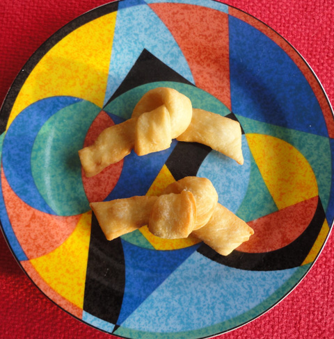 Leave in strips or tie in knots. If desired, dough may also be cut in 2-inch-long diamonds.