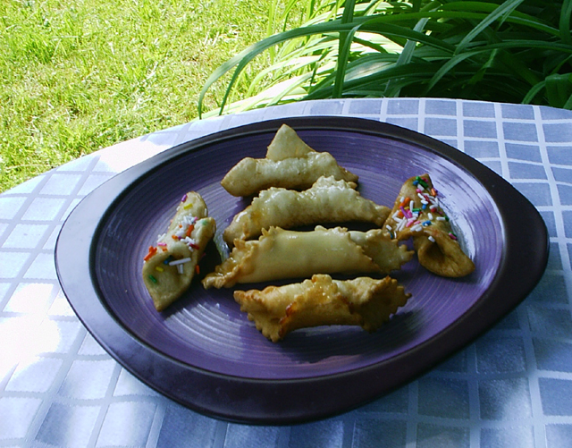 The above recipe for cannariculi appears over and over and over again on the internet in Italian. The ingredients and directions are rather vague. I suppose it's assumed that everyone knows how to do this fritter. On the Italian net this recipe is always described as being traditional and coming from Calabria. I suspect there are actually hundreds of variations, they're just not on the net.... Photo: Mary Melfi. |