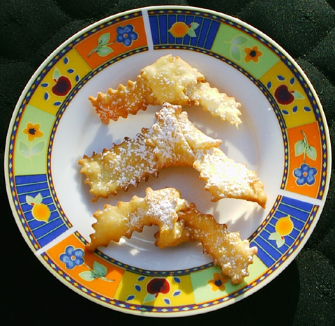 This is yet another variation on the traditional Italian carnival fritter. The original recipe which I found in an old Italian cookbook (published in 1948) contained too many eggs and too little sugar. I adapted the recipe and found the result rather pleasing. Possibly, that's because I prefer fritters that are flavored with vanilla, lemon, orange, or almond extract to those that don't use any special flavorings. Prior to World War II few fried doughs were flavored in Molise (my birthplace). Of course, nowadays, cooks in Molise and/or anywhere else have changed their "traditional" recipes and adapted them to suit their own tastes. The world is at one's fingertips, so, why wouldn't it show up in one's foods? Photo: by the contributor. |