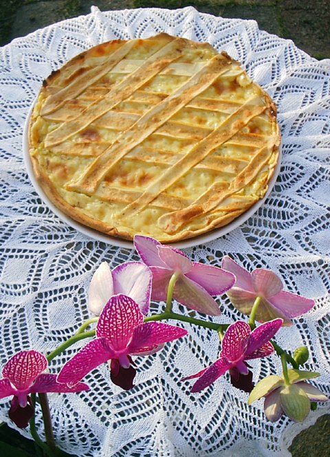 This recipe was often done for the Easter holidays by Maria Elisa's mother, Mrs. Immacalatina (Tina) Guida in the late 1950s. Marisa notes that when she was growing up in Sorrento, Campania cooks preferred to use barely rather than rice in their Easter pies. In fact the use of rice was frowned upon; it was seen as a poor substitute for barely. Also, in Sorrento, unlike in other parts of Southern Italy, butter was often used in the making of desserts. Sorrento was often referred to as "the city of butter...." The pie was made for the Easter holidays by Mrs. Immacalatina Guida's daughter, Marisa Pastore. Photo: Mary Melfi. |