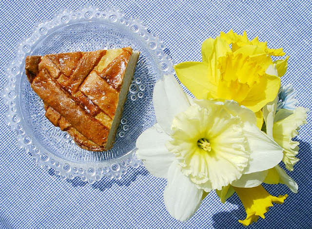 Preheat your oven to 375 degrees F (190C); prepare an 11-inch porcelain pie pan. Roll the chilled dough into a 1/4-inch-thick (5 mm) round, then fit it into the base of the pie pan. Pour in the ricotta mix, then roll out the dough scraps and cut them into strips. Make a pretty lattice pattern, pressing them into the overhanging dough on the sides, and then trim off the edges.