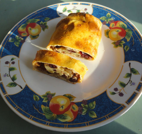 Notes The recipe in this entry was taken from "La Scienza in Cucina e L'Arte di Mangiar Bene manuale Pratico per le Famiglie" compilato da Pellegrino Artusi. The book was first published in 1891. Since then many Italian editions have been published. English translations of this cookbook under the title "Science in the Kitchen and the Art of Eating Well" are available. At www.archive.org Olga Ragusa's selection of recipes from Pellegrino's famous Italian cookbook can be found in its entirety (It's free to download). Her selection entitled, "The Italian Cook Book," was first published in 1945 by S.F. Vanni.... The following text comes from Wikipedia: "An apple strudel Origin Place of origin Austria Details Type Pastry Main ingredient Filo pastry A strudel is a type of layered pastry with a sweet?filling. It is often served with cream. It became popular in the 18th century through the Habsburg Empire. Strudel is most often associated with Austrian cuisine but is also a traditional pastry in the whole area of the former Austro-Hungarian empire. The oldest Strudel recipe (a millirahmstrudel) is from 1696, in a handwritten recipe at the Viennese City Library, Wiener Stadtbibliothek. The pastry descends from similar Near Eastern pastries (see baklava and Turkish cuisine). Etymology Strudel is an English loanword from German. The word derives from the German word Strudel, which in Middle High German literally means 'whirlpool' or 'eddy'. In Hungary, it is known as rtes, in Bosnia and Herzegovina, Croatia and Serbia as trudla or savijača, in Slovenia astrudelj or zavitek, in the Czech Republic as zvin or trdl,in Poland and Romania as ștrudel, and in Slovakia as trdľa or zvin. The pastry The best-known strudels are Apfelstrudel (German for apple strudel) and Topfenstrudel (with sweet soft quark cheese, in German Topfen cheese), followed by the Millirahmstrudel (Milk-cream strudel, Milchrahmstrudel). In Slovenia, cottage cheese is used instead of quark. Other strudel types include sour cherry (Weichselstrudel), sweet cherry, nut filled (Nussstrudel), Apricot Strudel, Plum Strudel, poppy seed strudel (Mohnstrudel), and raisin strudel.There are also savory strudels incorporating spinach, cabbage, pumpkin, and sauerkraut, and versions containing meat fillings like the (Lungenstrudel) or (Fleischstrudel). Traditional Austrian and Czech Strudel pastry is different from strudels elsewhere, which are often made from puff pastry. The traditional Strudel pastry dough is very elastic. It is made from flour with a high gluten content, egg, water, and butter with no sugar added. The dough is worked vigorously, rested, and then rolled out and stretched by hand very thinly with the help of a clean linen tea towel[11] or kitchen paper. Purists say (hyperbolicly) that it should be so thin that you can read a newspaper through it. A legend has it that the Austrian Emperor's perfectionist cook decreed that it should be possible to read a love letter through it. The thin dough is still laid out on a tea towel, and the filling is spread on it. The dough with the filling on top is rolled up carefully with the help of the tea towel and baked in the oven......." P.S. I tried this recipe and found the filling for the strudel very good. The use of currants makes it colorful and tasty. Photo and notes: Mary Melfi. |