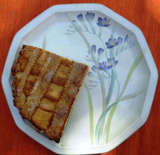 Grease a deep pie pan, and line it with the rolled out pasta frolla pastry dough.