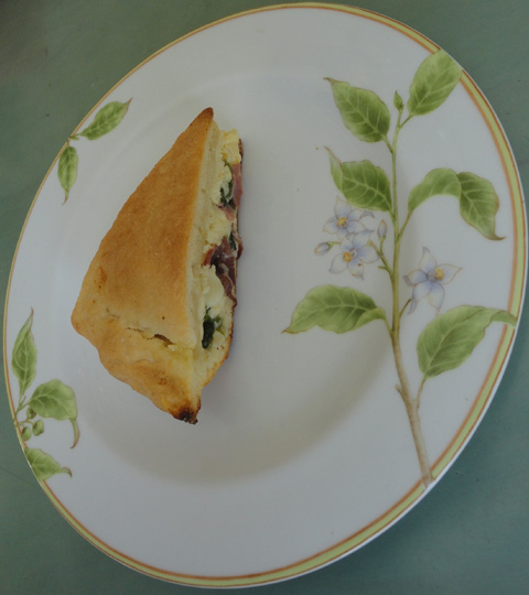Notes The recipe in this entry was adapted from one published in, "Better Homes and Gardens, Italian Cook Book (Des Moines, Iowa: Mereditch Corporation, 1983). The cookbook can be borrowed for free from the on-line public library, www.openlibrary.org.... P.S. Better Homes and Gardens' cookbook does not indicate that this is an Easter pie, but this style of pie is generally served on Easter morning or on Easter Monday. The following text comes from Italian Wikipedia: (Google Machine translation): Place of origin Italy Italy Liguria Region Production area Genovesato Details Category dish Recognition P.A.T. Product Vegetable Sector Easter cake ( cake pasqualinna in Ligurian ) is the name of a cake, usually salty, typical of Liguria (more precisely, of the Genoese) which is prepared in other parts of Italy with different characteristics (sometimes sweet version). Baked, is typical of the Easter season. It is prepared by spreading thin layers of dough made with flour, water and olive oil (without yeast). The sheet obtained which will serve for the fund should be larger than the pan, and, at this stage of the preparation, must hang it from the tank . If you want to stretch two sheets, one on the other. Then you pour the filling, prepared with beets (known herbs), fresh peas and artichokes (a must thorny violet artichoke Albenga) thinly sliced and in a frying pan with a little extra virgin olive oil with onion new two beaten eggs and mix the filling, grated cheese, salt and chopped fresh marjoram, then covering the whole with bits of curd (prescinseua in Ligurian language). Spread on the pastry over the filling is practiced with the help of a spoon, some grooves in which they are dropped some eggs; become boiled with baking the cake. On each egg you can put a little salt and pepper. Above all this recline the sheets of coverage, at least two, thin, between the one and the other, greased to prevent sticking together, blows with the aid of a straw, so as to create inside an air chamber. Then roll up on the edge of the pan together with the lower one , creating a decorative scalloping. It is baked in the oven. The cake at the end of cooking will have a pleasant appearance of fullness. To check the baking of the pastry housewife left a piece of the dough out of the scallop, called oêgin (auricle ). The traditional Easter cake is typical of the Easter season, i.e. spring and its products : eggs, herbs, artichokes, peas, spring onions, marjoram, a time in every garden in Liguria. It is the highlight of the Easter lunch and in the past was the apotheosis of the ability of housewives, it is said that legendarily were able to superimpose up to thirty sheets in homage to the years of Christ. A variant for other periods involves the use of beets and other vegetables instead of artichokes. The existence of the Easter cake Genovese is documented from the sixteenth century, when the literary Hortensius Lando mentions in the catalog models inventors of the things you eat and makes you drink. Then it was known as gattafura , because the cats willingly furan et vague they are , but also the same writer he was greedy enough to write : "I liked them more than the honey bear ." In past centuries, eggs and cheese, essential ingredients of pasqualina were foods that were eaten only on special occasions . In Ventimiglia wild herbs are used in the filling (caccialepre , nettle, allattalepre , valerian ), instead of the chard and borage. The Easter cake must be paired with young white wine , fragrant, dry but soft and savory, such as Vermentino, served at 10 ° C. Lazio and Liguria have registered with the Ministry of Agriculture two traditional Italian food products under the name of Easter cake." Original Italian text: "Torta pasqualina Da Wikipedia, l'enciclopedia libera. TORTA PASQUALINA Origini Luogo d'origine Italia Italia Regione Liguria Zona di produzione Genovesato Dettagli Categoria piatto unico Riconoscimento P.A.T. Settore Prodotto Vegetale Torta pasqualina (in ligure torta pasqualinna) è il nome di una torta, solitamente salata, tipica della Liguria (più precisamente del Genovesato) che viene preparata anche in altre località d'Italia con caratteristiche differenti (talvolta anche in versione dolce). Cotta al forno, è tipica del tempo pasquale. Si prepara stendendo sfoglie sottilissime di pasta preparata con acqua, farina e olio di oliva (senza lievito). La sfoglia ricavata che servirà per il fondo deve essere più grande del tegame, e, in questa fase della preparazione, deve pendere fuori dal recipiente. Se si vuole si stendono due sfoglie, l'una sull'altra. Indi si versa il ripieno, preparato con bietole (cosiddette erbette), piselli freschi e carciofi (d'obbligo il carciofo spinoso violetto di Albenga) affettati sottilmente e passati in padella con un po' d'olio extravergine d'oliva con code di cipollina nuova, due uova sbattute e mescolate al ripieno, formaggio grattugiato, sale e maggiorana fresca tritata, quindi si copre il tutto con pezzetti di quagliata (prescinseua in lingua ligure). Sul ripieno steso sulla sfoglia si praticano, con l'aiuto di un cucchiaio, alcuni incavi nei quali vengono fatte cadere alcune uova intere; diventeranno sode con la cottura della torta. Su ogni uovo si può mettere un po' di sale e pepe. Sopra a tutto ciò si adagiano le sfoglie di copertura, almeno due, sottilissime; tra l'una e l'altra, unte per evitare che si attacchino tra loro, si soffia con l'aiuto di una cannuccia, in maniera da creare all'interno una camera d'aria. Quindi si rimboccano sul bordo del tegame insieme a quella inferiore, creando una festonatura decorativa. Si cuoce nel forno. La torta a fine cottura avrà un gradevole aspetto di pienezza. Per controllare la cottura delle sfoglie la casalinga lasciava un pezzo della pasta fuori dalla festonatura, chiamato oêgin (orecchietta). La tradizionale torta pasqualina è tipica del periodo pasquale, cioè della primavera e dei suoi prodotti: uova, erb